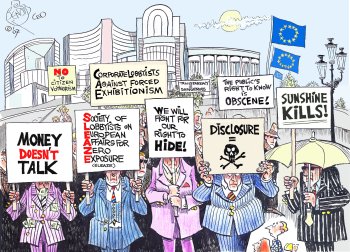 EPACA describes itself as “the representative trade body for public affairs consultancies working with EU institutions”. A role for which it has taken high-profile and determined action in recent months against the European Commission’s plans for a lobby transparency register – even though initial measures of transparency control will be fairly weak. The designated obligations to disclose their financing within this register have caused outrage among the Brussels-based lobby consultants. EPACA’s media offensive denounced the Commission’s transparency plans as “excessive”, “an unnecessary burden”, “impossibly complex” and “voyeurism”, and even threatened to boycott the transparency register. Amongst the range of criticisms that EPACA throws at the Commission’s transparency plans is the argument that “money does not equal influence”, so financial disclosure is therefore irrelevant or even “dangerous”. EU Commissioner Kallas, who heads the transparency work, replied by suggesting that “nobody would pay real money for lobby services without expecting something in return – and that ‘something’ is influence”. Yet EPACA is determined to maintain the shroud of secrecy that cloaks the clients they lobby for, and sources of financing. EPACA’s (over-)reaction and its shifting of positions demonstrate they are political opportunists of the highest degree. Initially EPACA argued for a voluntary register, now they argue for a mandatory one, but without financial disclosure. The main target seems to be to delay and eventually stop the whole transparency initiative. The opportunistic attitude is further revealed by the fact that many of EPACA’s members are subsidiaries of US-based consultancy firms that operate in Washington D.C., where for more than a decade, far more stringent mandatory lobby disclosure obligations have been in place. There can be little doubt that these professional spin-masters know very well that the (often contradictory) arguments they present against a meaningful lobby register are fundamentally flawed. Expose these cynical opportunists and use your free vote to cast influence and award them with the Worst Lobby Award 2007. Sources:Hired-gun lobbyists in last-ditch battle against EU transparency plans, Corporate Europe Observatory, August 2007. ReactionEPACA reacts to nomination for Worst EU Greenwash Award 2007, 14 November 2007. Comments132 Juergen Isensee 5 December 2007: Nicht die Bürger, sondern Lobbyisten müssen so gläsern wie irgend möglich sein. Jeder Parlamentarier und jeder Beamte soll hargenau wissen, von wem ein Lobbyist wieviel Geld erhält 127 transparent citizen 4 December 2007: Governments and Industry like us to be as transparent as possible and themselves to be as intransparent as possible. I’d rather have it the other way around. Just as: People should not be afraid of their governments, but governments should be afraid of their people. 108 May-Lise Talgø 27 November 2007: Power corrupts! Do we really need an EU parliament? More power to the people! Let’s dissolve the EU and connect real people into real decision making processes!!! 91 Volker Racho 20 November 2007: Bei dem vorliegenden Wissen über den Lobbyismus, wie er wirklich ist mit all seinen Verstrickungen.Muss die Frage erlaubt sein, ob die RAF, die Terroristen waren oder doch die privilegirten Persönlichkeiten von oben. 85 Martin Guardini 17 November 2007: in der neutralen Schweiz habe ich gelernt, dass die beste Taktik darin besteht:alles offenlegen, aber falsch interpretieren. 83 Nico Saringer 16 November 2007: Transparenz ist das a und o für ein friedliches miteinader. 80 Erwin Scholze 13 November 2007: In einer guten und dauerhaften Transparenz sehe ich nachhaltig DIE Zukunft für ein gemeinsames Europa. 58 Martin Auer 2 November 2007: Mehr Tranzparenz muss her! 53 V. Lombard 1 November 2007: If these lobbying agencies are emanations from their US counterparts, we may wonder if the EU Commission is more or less influenced by policies inspired by Washington… The issue is serious enough to set up a very strict code ruling lobbies & lobbyists. Not everything’s bad in the US – maybe we could implement similar or even stricter laws for lobbies here in the EU. I hope so ! Our future as Europeans may depend on our ability to control these people. 51 Frank van Schaik 1 November 2007: The cartoon is great! Reminds me of the german word for “banners”: Transparanten! Maybe EPACA should rename themselves into OPAQUA, to clarify more what they are about. but then again, exactly that is what they wouldn’t want to do. well, the y get my vote abnyhow. 49 R. Wagner 28 October 2007: Auf jeden Fall mehr Tranzparenz,besonders bei Ärzten 47 Jan Saver 26 October 2007: More transparency is clearly a good thing for everyone involved. The behaviour of some consultancies can be best described as dishonest, cashing in on outsiders’ desire to get closer to EU decision making and freeriding on EU officials’ openness and hard work. Having a mandatory and strict code will also introduce more fair competition between lobbying firms. It will force them to produce real value rather than make promises and flaunt contacts. Hopefully a solid code will succeed in separating the wheat from the chaff so to say. 46 Anna van Marle 26 October 2007: Scandaleux!!! 40 Andreas Schmitt 22 October 2007: mehr Transparenz, bitte! | ||||||