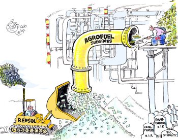 Repsol is a leading oil corporation. Repsol’s Luis Cabra, Director of Technology, chairs the European Biofuels Technology Platform (EBFTP), an industry-dominated advisory group promoted by DG Research and partly funded by the Commission. The Commission has entrusted the group to elaborate the Strategic Research Agenda (SRA) on agrofuels which will identify key research areas (and allocating funds) for the next 20 years. In September 2007 a draft SRA, completed by Repsol and other EBFTP members was made public. This draft proposed an astonishing and ambitious target for 25% of road transport fuel to be agrofuels by 2030. The Platform describes itself (and therefore the SRA) as a multistakeholder effort bringing together “the biofuels community”. Yet despite rhetoric about open participation, membership has been stitched up from the start. For example, members of the Platform’s steering committee were chosen by the Chair (fromVolvo) and the vice-Chairs of BIOFRAC (the predecessor of the Platform, dominated by oil, car and biotech companies). Unsurprisingly, the result is an organisation full of industry representatives and research centres with close ties to industry. There is not a single citizen organisation represented. As for the 5 working groups, there are only 2 NGO representatives out of some 125 members. Importantly, Repsol and the other corporations in the EBFTP have a commercial interest in the development of agrofuels in the EU, and they are now designing this policy agenda. The impacts of their ‘advice’ through the EBFTP are far-reaching and already evident. For example, the EU has already proposed a binding target of 10% use of agrofuels in all road transport fuel by 2020. This pays no attention to concerns that agrofuels threaten to exacerbate the problem of climate change and create a range of new insecurities and devastation. Vote for Repsol and help unmask the corporate takeover of public research! Supporting documentsThe EU’s agrofuel folly: policy capture by corporate interests, Briefing paper, Corporate Europe Observatory, June 2007 Comments156 Paul Johan de Graauw 15 December 2007: De la poudre aux yeux de nous tous et beaucoups de “blé” dans les poches de certains gros céréaliculteurs ! Démystifions cette affaire ! 155 Bernie Rees 14 December 2007: Who appointed Louis Cabra in the first place? Didn’t they know what would happen? Well, hypocrisy is not a sin, but environmental degradation should be a capital offence. Doing nothing lets the selfish and the greedy benefit now, but later everyone loses. Thank you for this website. 151 Aitor Galan 13 December 2007: Claro, ahora no es solo posible sino necesario el uso de necrofuels, pero sigue estando prohibido merzclar aceites vegetales reciclados en el Diesel para circular. El Transporte en España es un monopolio… 142 Jean-Louis 7 December 2007: Normal, ce sont les habitudes de Repsol connue aussi pour ses méthodes de gestion humaine en France. 140 Jarguel Claudine 7 December 2007: Il faut que tous politiques dénoncent et fassent cesser ces projets d’agrocarburants qui ne feraient qu’accélérer le processus de catastrophe écologique. qui nous guette. 123 Lisembard Daniel 3 December 2007: contre l’arnaque du siècle ventant les agrocarburants (en fait nécrocarburants)comme solution écologique, votons repsol ! 110 Meta Retzlaff 27 November 2007: Verachten das Antzlitz der Erde,lachen über Nachhaltigkeit,feiern hungernde Menschen 109 Kay Wagland 27 November 2007: We say ‘listen to the science – not commercial interests’, but how can we do that if corporations are taking over and distorting research? Agrofuels could be the nail in the coffin of climate change, particularly if sourced from tropical plantation. EU policy now needs a complete rethink. 107 Marie-Hélène Chambrette 27 November 2007: l’indépendance de la recherche publique -ainsi que les universités!!!- par rapport aux intérêts privés me parait essentielle dans tous les domaines 103 erwin greiler 26 November 2007: gentechnik ole!!! 99 Nora 26 November 2007: j’hésitais entre donner mon vote à BMW et al. ou à Repsol, mais à la fin je trouve le lobby de Repsol le plus révoltant, car sa perversité est qu’ils soutiennent aussi que les biocarburants sont une solution écologique, c’est qui est d’une fausseté évidente 86 Karl Otto Henseling 17 November 2007: Hier will ein Dinosaurier des fossilen Zeitalters, die übermechanisierte und chemisierte Landwirtschaft, einem anderen, der Autoindustrie, Überlebenshilfe leisten – auf Kosten von Mensch und Umwelt. 76 Ralf Huber 12 November 2007: Palmoel, Ethanol aus Zuckerrohr, Genraps,… 66 Alexander Liedke 10 November 2007: das hat schlimme Konsequenzen für die weitere Entwicklung des Klimas! Das Leben zukünftiger Generationen vor wirtschaftlichen Interessen. 56 Wolfgang Schreiber 1 November 2007: Danke für diesen wertvollen Beitrag zur Demaskierung unserer Wirtschaftsbosse | ||||||